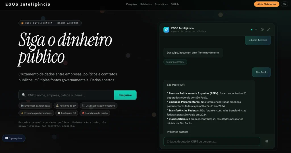 Um mês se passou e até agora nenhum dos projetos conseguiu tanta atenção quanto o hype inicial causado pelo tweet com dados ilustrativos (que inicialmente não deixou claro que se tratava de um mockup). Projetos como o inteligencia.egos.ia.br, por exemplo, retornam apenas erros ou pouquíssimos dados para cada requisição, e acumula tanta crítica quanto compartilhamentos no X.