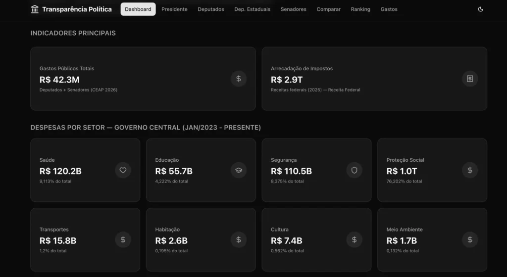 A interface do Transparência Política agrega dados da Câmara, do Senado e do Portal da Transparência em painéis navegáveis por deputado, senador, presidente e estado. Tem ranking, pesquisas de aprovação, comparação entre políticos e seção de gastos.