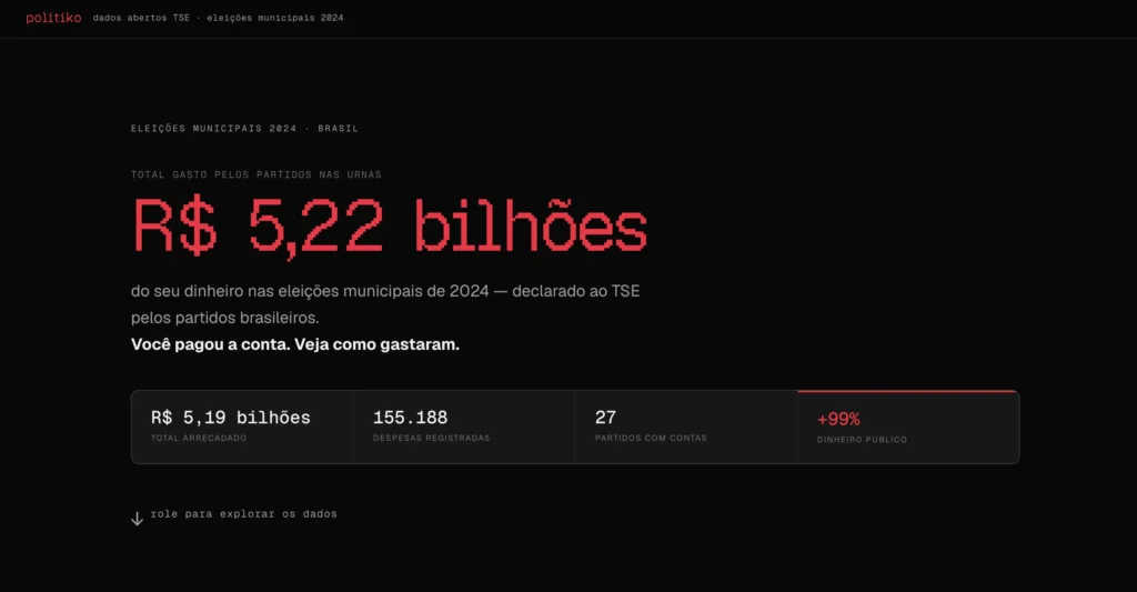O usuário @uphiago publicou no X que, motivado pelo trabalho de Bruno César, subiu um frontend sobre prestação de contas das eleições de 2024, disponível em politiko.vercel.app. O projeto está sincronizado com o site oficial do TSE e promete updates de enriquecimento de dados em breve. Por ora, é uma interface de consulta sobre financiamento eleitoral — útil, mas ainda sem o cruzamento que tornaria o projeto de Bruno tão impactante.