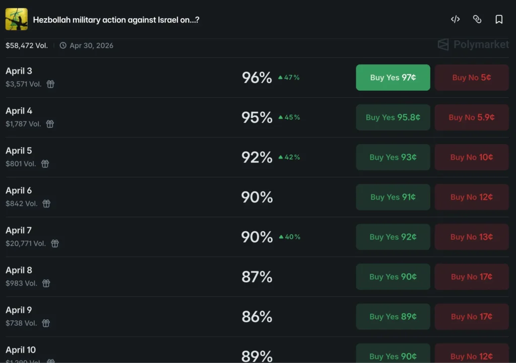 Neste momento, apostadores chutam se o grupo terrorista Hezbollah iniciará uma ação militar contra Israel nos próximos dias. As chances variam para cada dia de abril, indo de 86% a 96%.