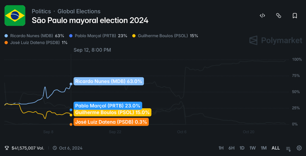 Vamos pegar um exemplo real. O primeiro turno das eleições municipais de São Paulo de 2024. Enquanto em 12 de setembro o Datafolha mostrava Nunes com 27%, Boulos com 25% e Marçal com 19%. O PolyMarket apresentava chances de Nunes em 63%, o Marçal em segundo com 23% e Boulos em terceiro com 15%.